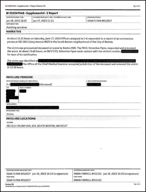 According to journalist, Aidan Kearney, the Boston Police Department report has redacted not only the deceased person’s name but also their age and their sex. Why is this? Normally, such details are only withheld from the public if the victim’s next of kin has not yet been informed. But this report clearly states that the deceased’s mother had already been notified.