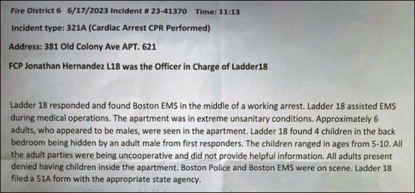However, on 23rd June, the Boston Police Department (BPD) issued a statement contradicting the official fire department report and refuting all previous media accounts. The statement claims that ‘the adults’ in the apartment were fully co-operative, that there were no drugs or ‘other concerning materials’ on the scene, that conditions were not unsanitary and that the children ‘all had a parent present’ and were not being deliberately hidden from the emergency service officers.