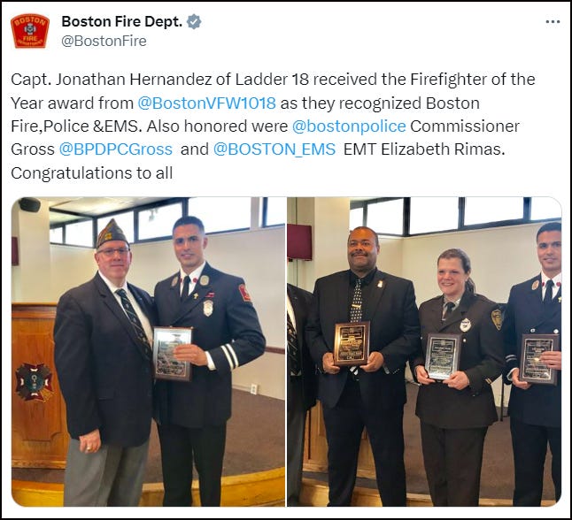 Officers of the Boston Fire Department (BDF), the Boston Police Department (BDP) and emergency medical service personnel all attended the scene. It seems that the fire department was the first to arrive.