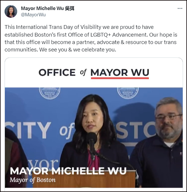 Last year, under Wu’s leadership, the mayor’s office created Boston’s first Office of LGBTQ+ Advancement to “Empower, protect, and advance the rights and dignity of Boston’s LGBTQ+ residents by developing policies, community-oriented programming, and providing resources for the city’s LGBTQ+ community”.