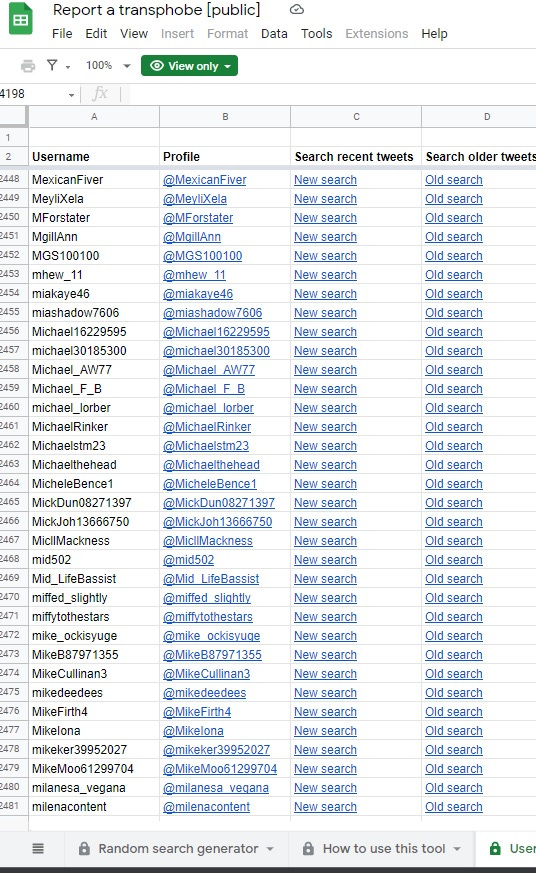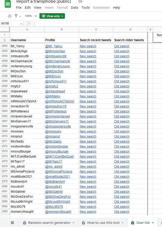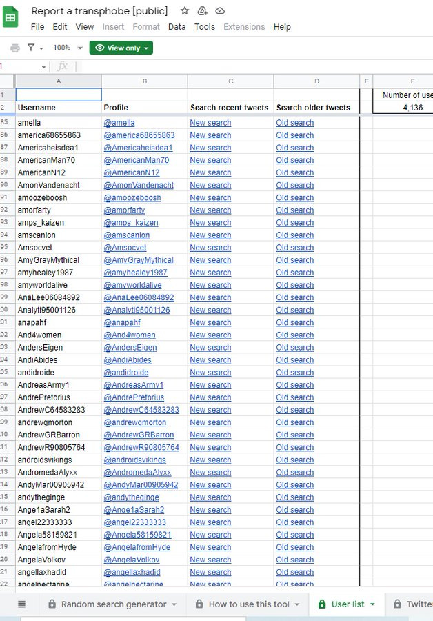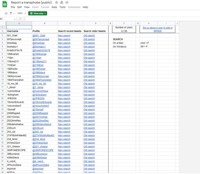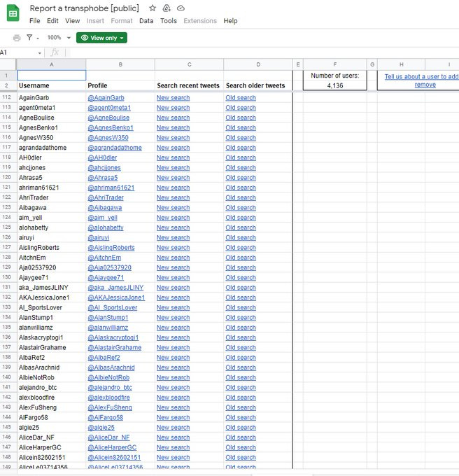 TRAs made a document targeting people to ban from Twitter /Reddit. I went undercover to get the old link, then had to contact a TRA to get new link, pretending I was a TRA. People on this list include Fred Sergeant. Old link was replaced by public link but I had to ask for it.