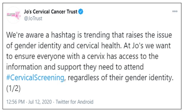 Same goes for the UK’s biggest cancer charity. It talks about “everyone with a cervix” when explaining the need for women to attend cervical screening appointments.