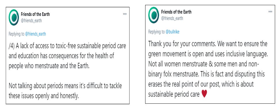 Friends of the Earth talk about “People who menstruate”. They also insist that “Some men and non-binary folx menstruate”.