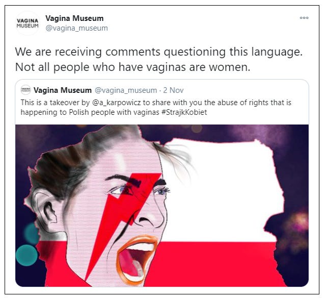 The Vagina Museum, a space dedicated to female reproductive anatomy, describes the devastating attack on women’s rights in Poland as happening to “people with vaginas”. It then compounds this female erasure by insisting that “Not all people who have vaginas are women”.