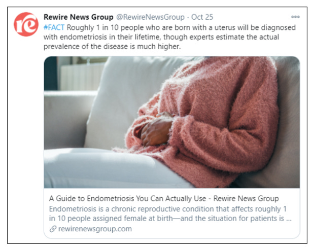 Rewire News Group is an organisation whose mission is “Empowering you to own your relationship to sex, abortion, parenthood, and power”. It talks about Endometriosis, a female-specific disease which is frequently underdiagnosed or dismissed, as affecting “people who are born with a uterus”. Who is that supposed to empower?